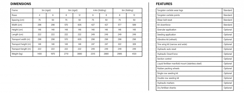 SPX strip-till features Depth The SPX can be operated to a depth of 40cm if required, however, in normal conditions, a depth of 15cm to 23cm is typical. A consideration when setting up the machine is that for every 5cm of depth, the draught force needed to pull the legs through the ground almost doubles, as well as increasing fuel consumption. Tine The tine assembly consists of the leg, shank, point and wing. Its purpose is to remove any compaction layers, move & fracture the soil, and place fertilizer accurately in the seeding zone (if fitted). Low and high disturbance points (27mm and 46mm), along with medium (130mm) and wide (160mm) wings are available to manage soil movement and lift. |